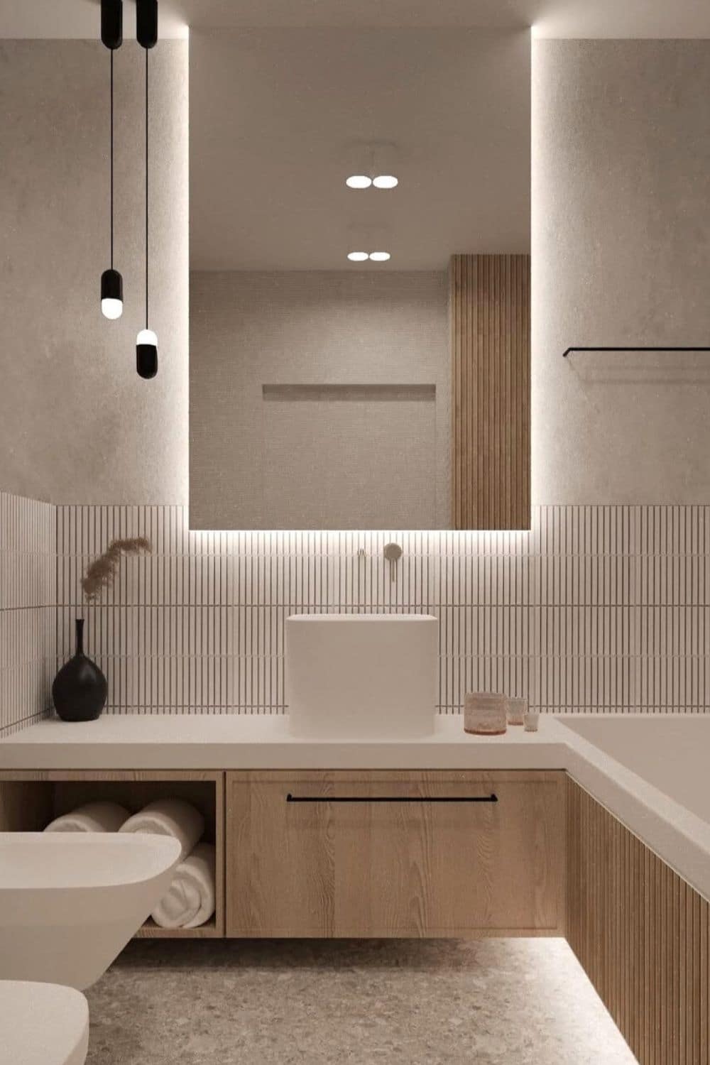 This is clearly evident in the run of the vanity unit which provides ample opportunity for storage and use. Teamed with those angular, vertical lines on the unit, tiles and lighting for a true Japandi feel.