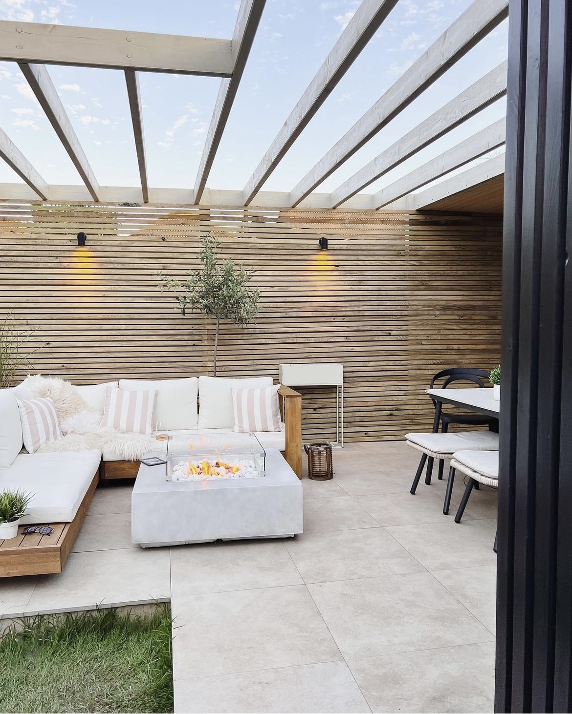 Paint your pergola black, it’s a key colour in this design scheme and will ground the rest of the space. Mix natural materials such as wood and rattan and add cosiness with solar powered lights and cosy outdoor cushions.