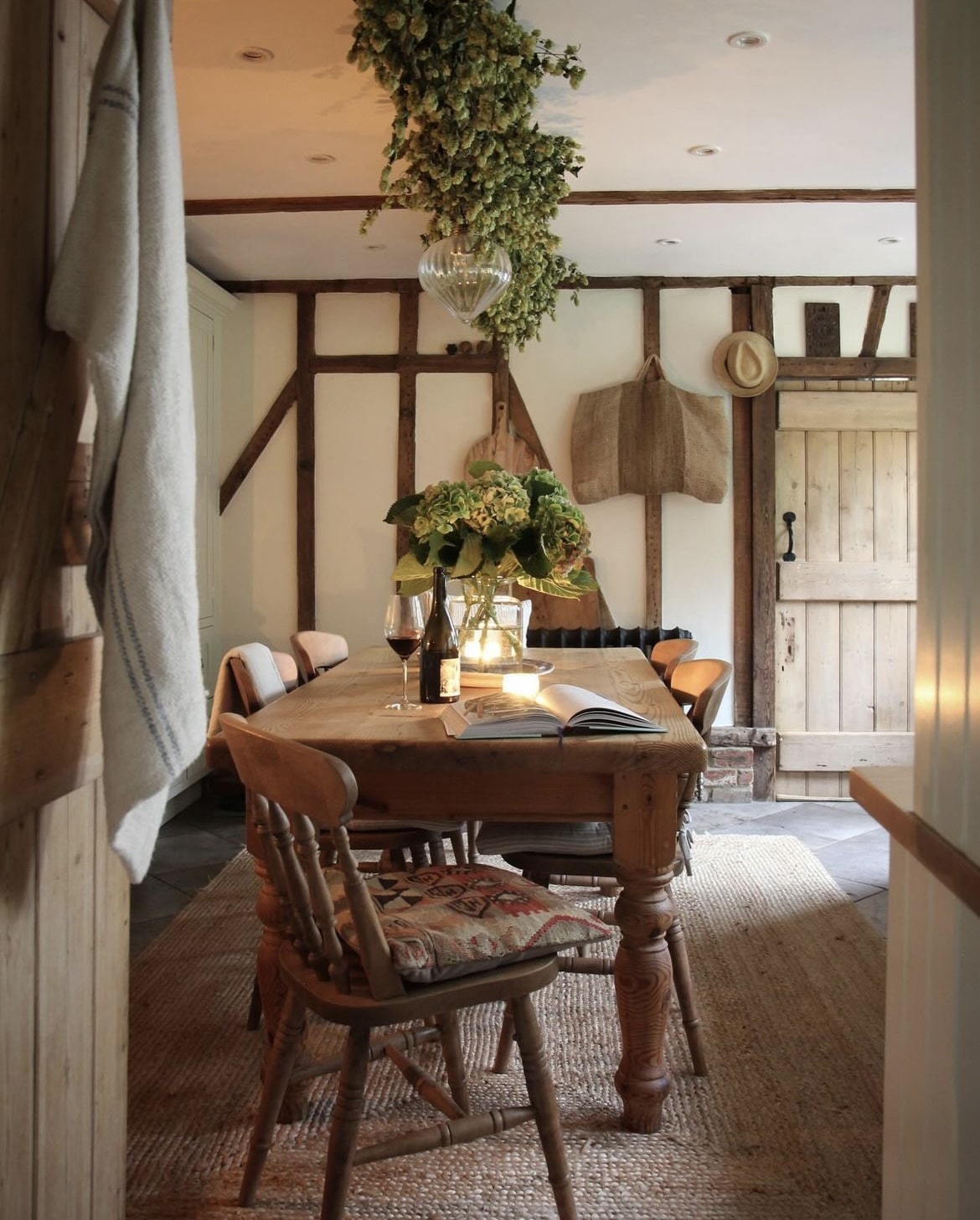 Carry on the rustic theme in your dining room by opting for dark wood furniture, rattan lighting and stone flooring.